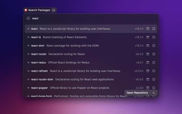 Raycast extension to search for npm packages using npms.io